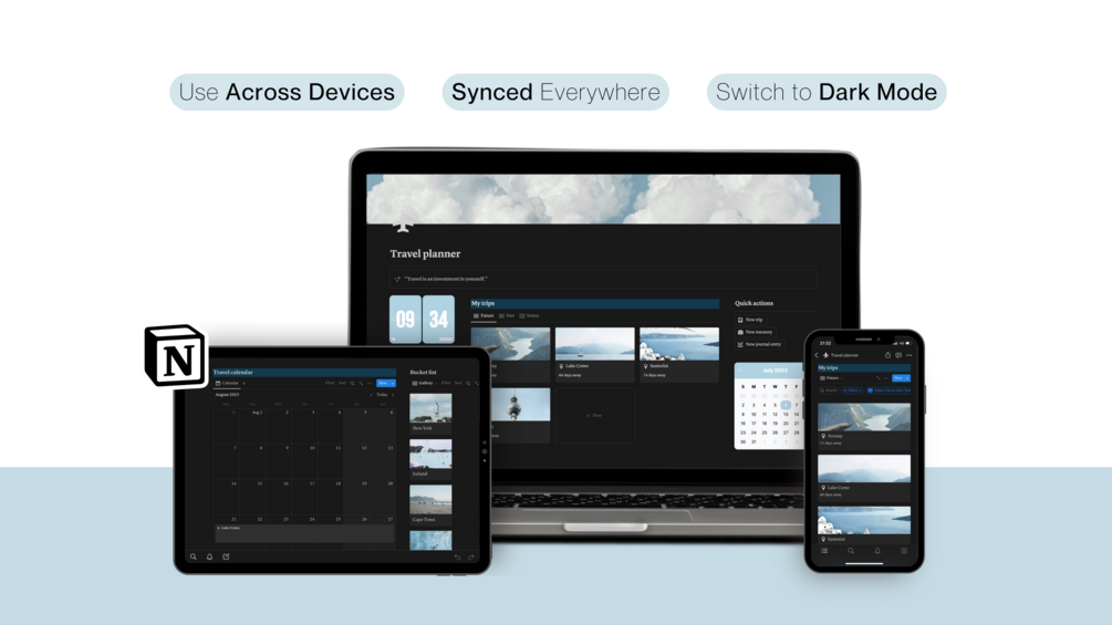 The ultimate all-in-one digital travel planner template for Notion, in the theme Sky Blue.